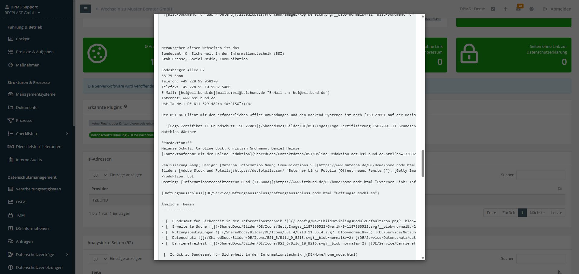 - Der Webseiten-Scan wurde erweitert. Das ausgelesene Inhalte des Impressums und der Datenschutzinformationen können jetzt direkt eingesehen werden.