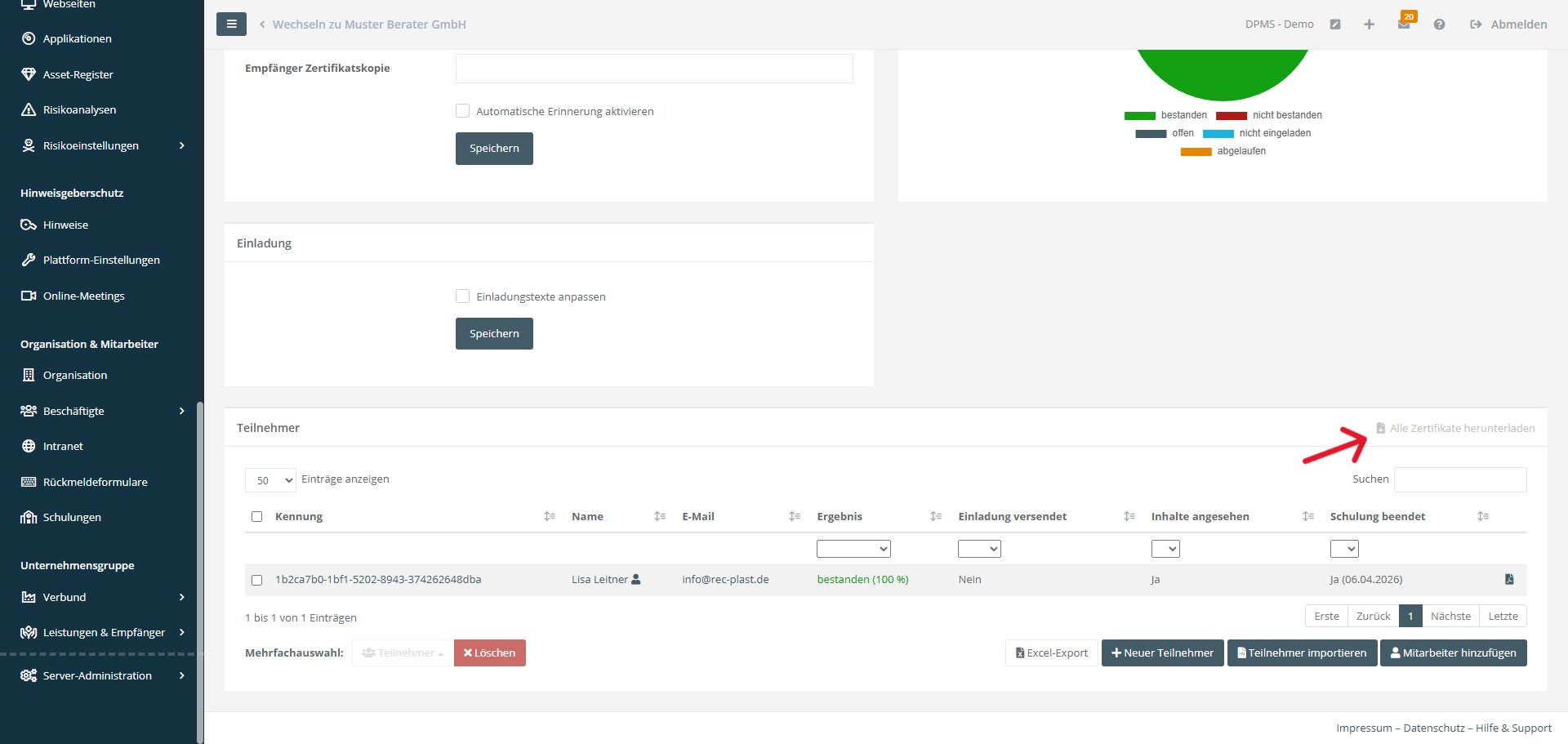 - Im Schulungsmodul ist nun ein Mehrfach-Download aller Teilnahmebescheinigungen aller Teilnehmenden einer Veranstaltung möglich.