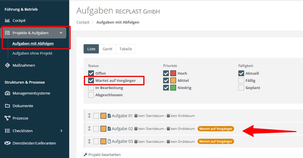 - Alternativ können alle Aufgaben eingeblendet werden (Anzeige mit Label „Wartet auf Vorgänger“)