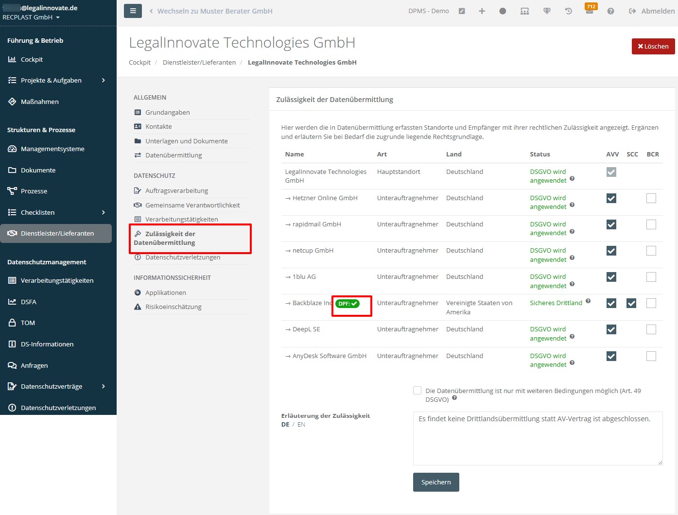- Bereich Zulässigkeit der Datenübermittlung: Angabe der Rechtsgrundlage (AVV, SCC, BCR) zu jedem Empfänger; integrierte Bewertung nach DPF für Übermittlungen in die USA