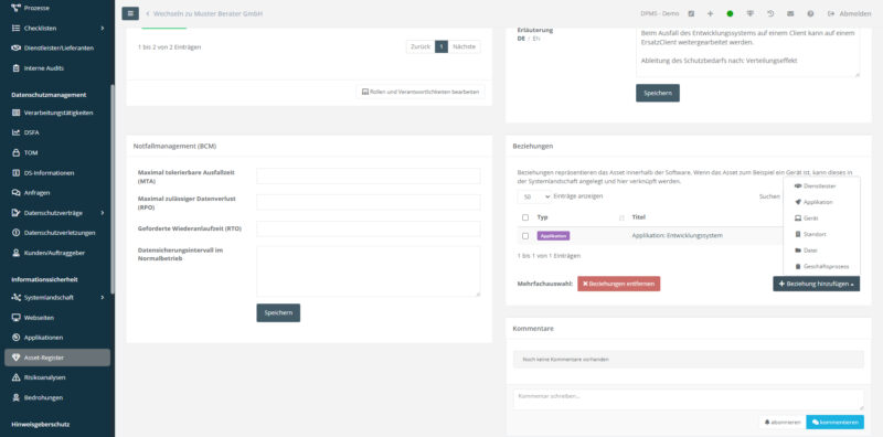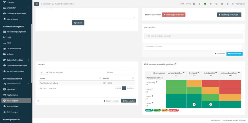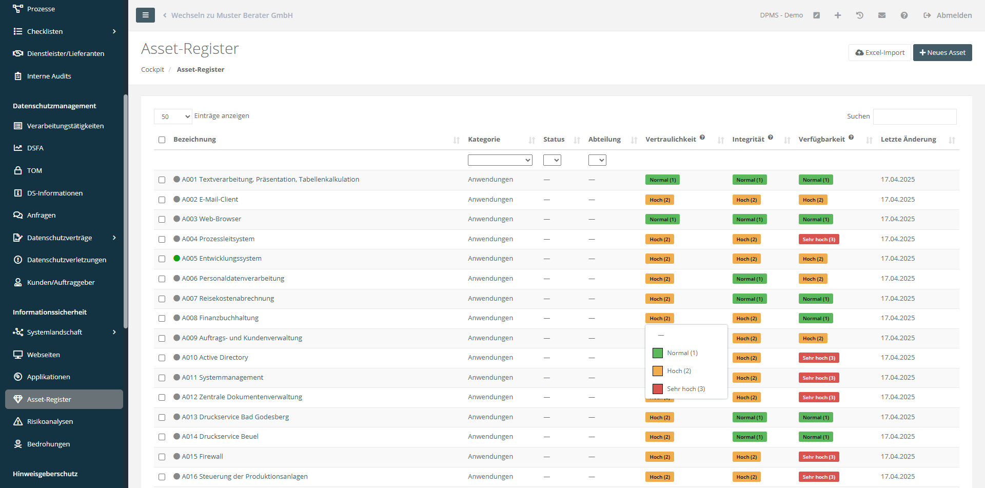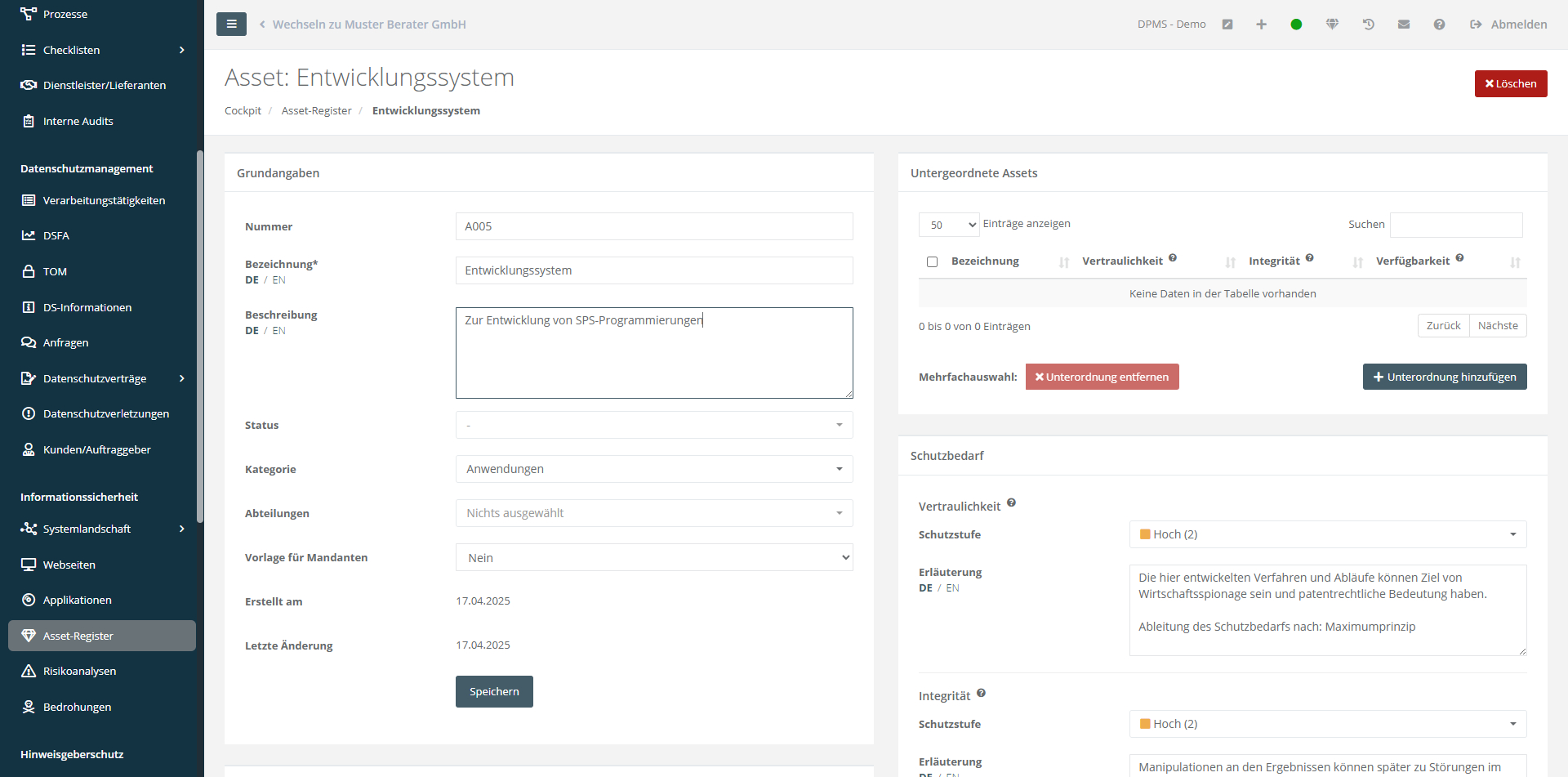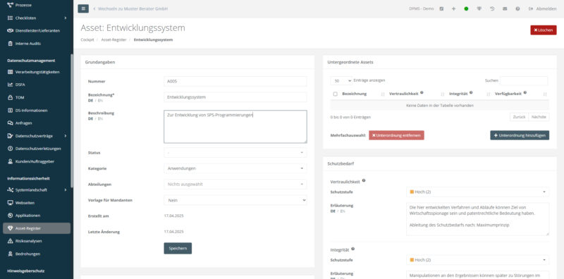 Mit dem Asset-Register erfassen und verwalten Sie Werte im Kontext der Informationssicherheit. Assets werden identifiziert und der erforderliche Schutzbedarf definiert.