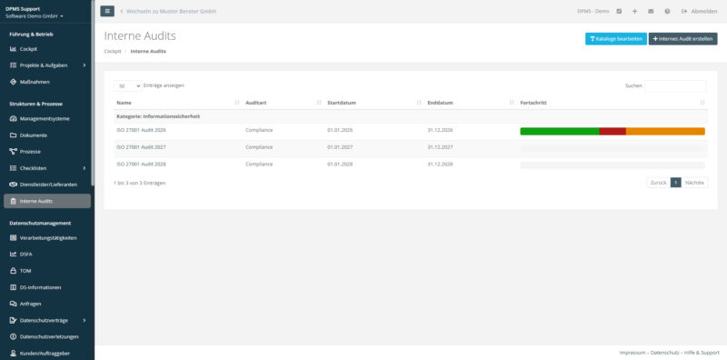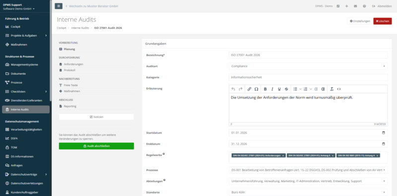 In den gängigen Normen und Managementsystemen spielen interne Audits eine zentrale Rolle. Mit dem Modul „Internes Audit“ erstellen Sie einen strukturierten Auditplan und definieren die relevanten Auditbereiche.
