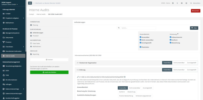 Audits lassen sich mit passenden Fragenkatalogen planen und durchführen. Abweichungen werden dokumentiert, sodass daraus passende Maßnahmen abgeleitet und nachverfolgt werden können. Auf diese Weise verbessern Sie kontinuierlich Ihr Managementsystem und erfüllen normative Anforderungen.