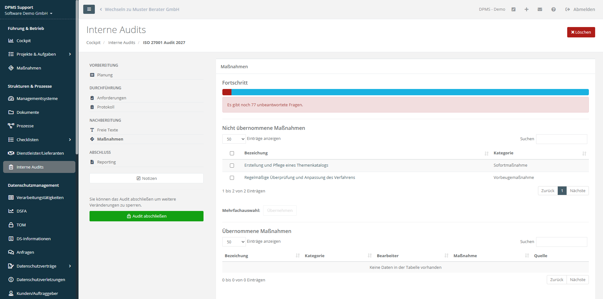 Audits lassen sich mit passenden Fragenkatalogen planen und durchführen. Abweichungen werden dokumentiert, sodass daraus passende Maßnahmen abgeleitet und nachverfolgt werden können. Auf diese Weise verbessern Sie kontinuierlich Ihr Managementsystem und erfüllen normative Anforderungen.