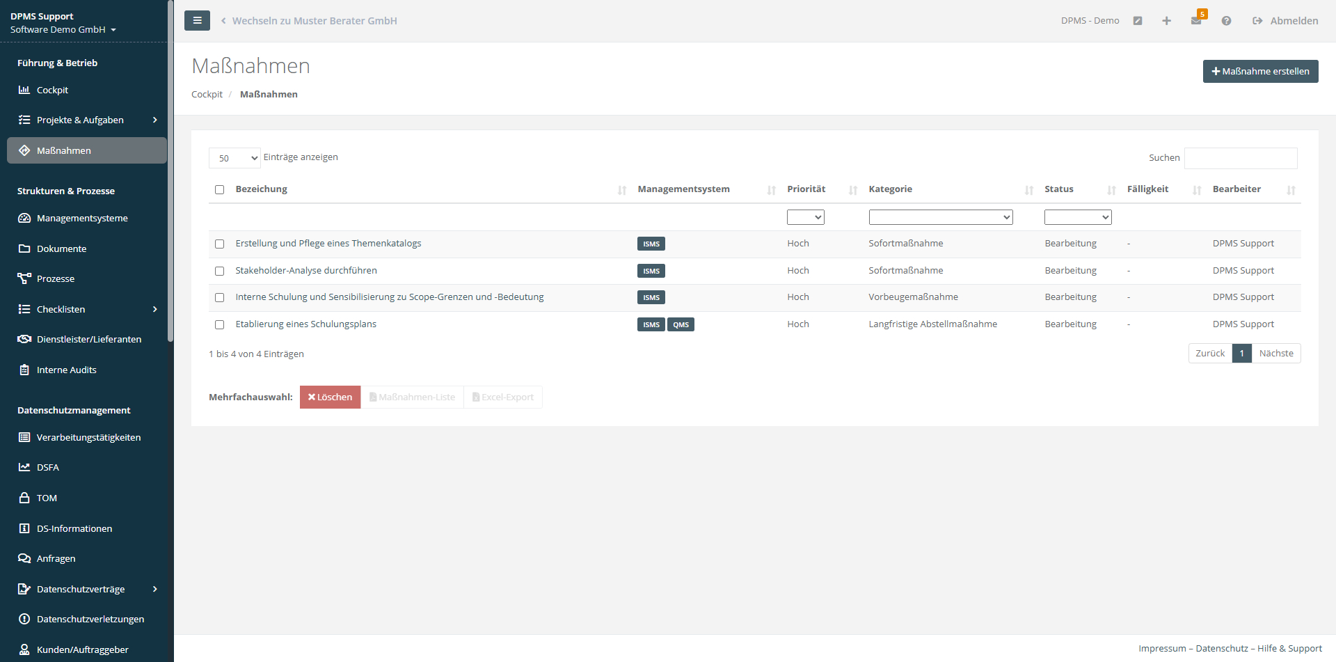 Verschiedene Module wie zum Beispiel das Managementsysteme-Modul, das Interne Audit oder die Risikoanalyse erzeugen Maßnahmen, die im Maßnahmenmodul gesammelt, verwaltet und nachverfolgt werden können.