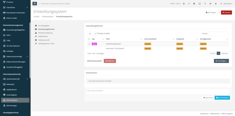 Innerhalb der Analyse bestimmen Sie den Anwendungsbereich, beispielsweise durch die Auswahl der Assets aus dem Asset-Register.