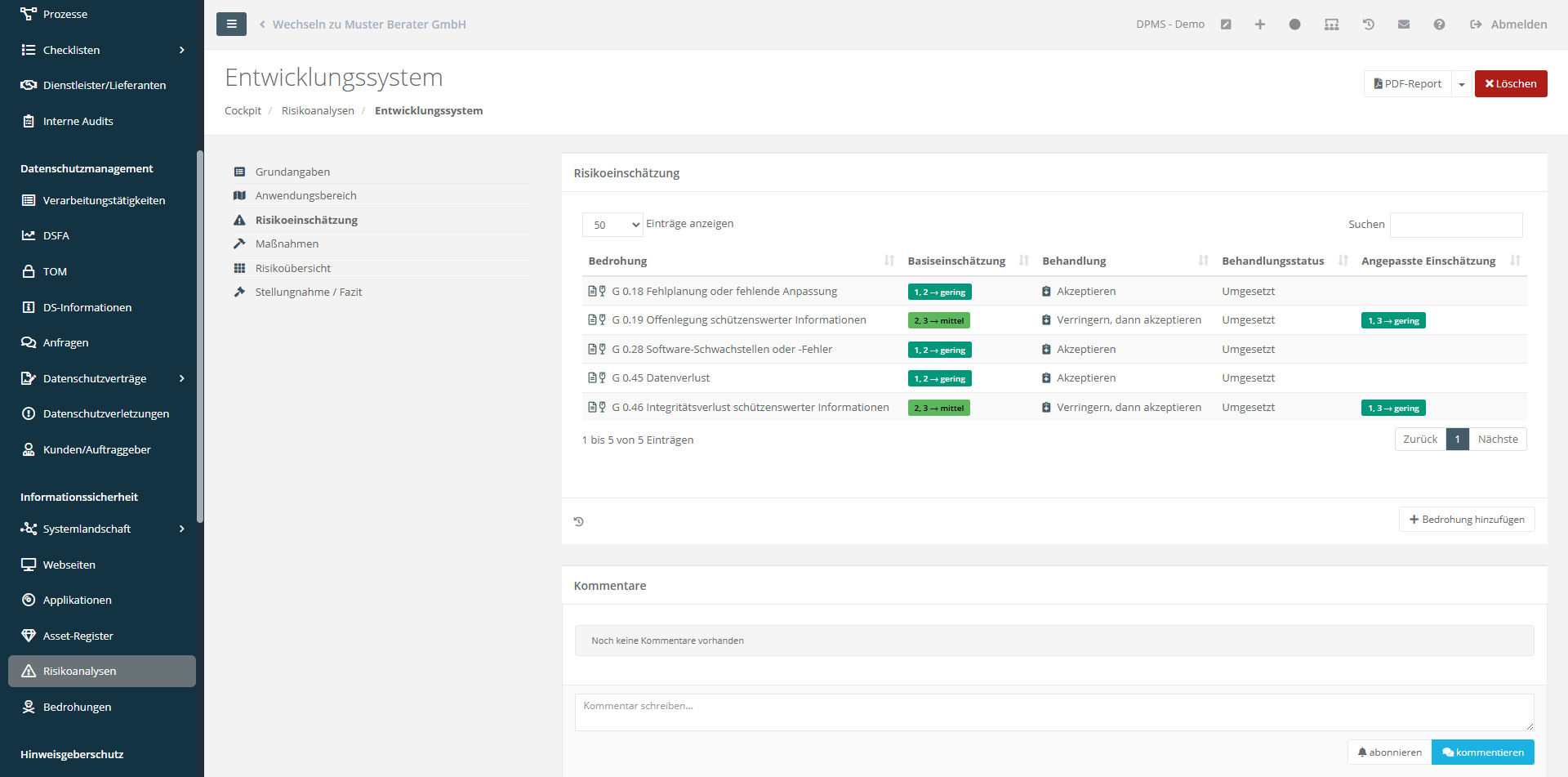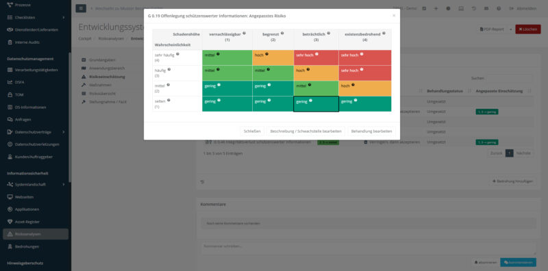 Für jede identifizierte Bedrohung werden Eintrittswahrscheinlichkeit und Schadenshöhe bewertet, sodass eine transparente Risikoeinstufung entsteht.
