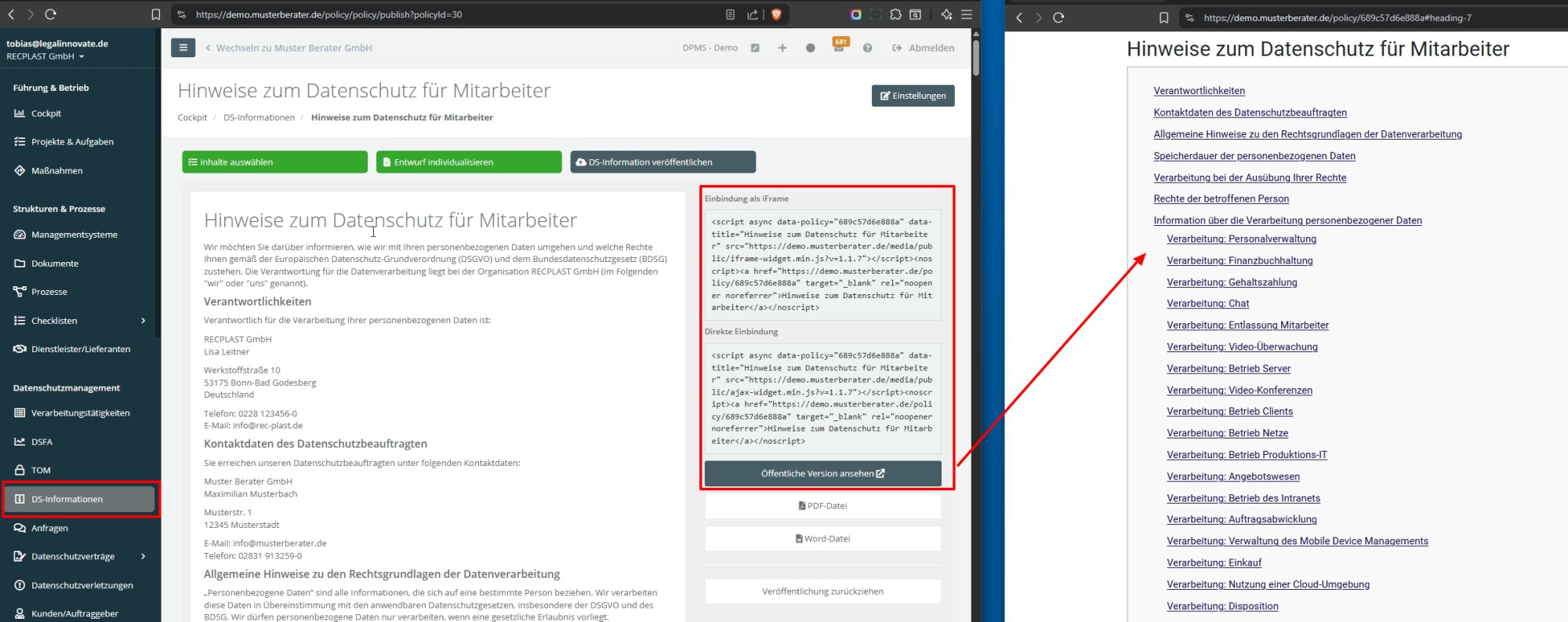 data-titledas Attributtitlefür den eingefügten Iframe fest. - Zusätzlich wird nun automatisch ein klickbares Inhaltsverzeichnis aus den Überschriften der Datenschutzinformation generiert. Dies verbessert die Navigation für die Leser, die per Klick direkt zum jeweiligen Abschnitt springen können.