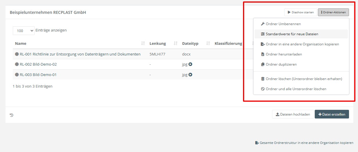 - Neues Menü „Ordner-Aktionen“: Bietet Zugriff auf zentrale Funktionen wie Ordner umbenennen, Standardwerte für neue Dateien festlegen, Ordner kopieren, herunterladen, duplizieren oder löschen.