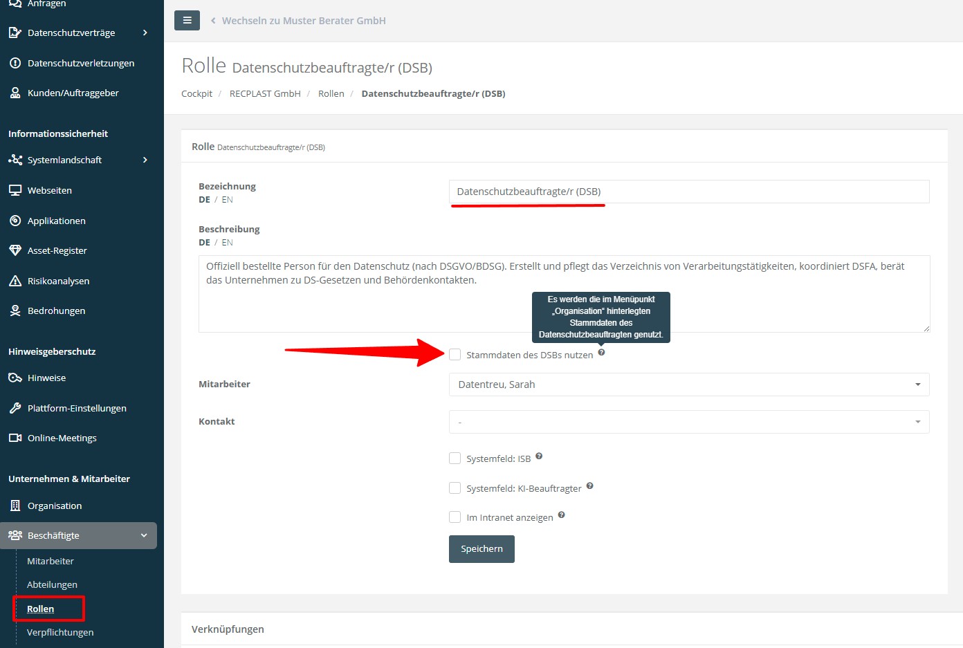 - Im Bereich „Rollen“ können Sie bei der Anlage der Rolle „Datenschutzbeauftragte/r (DSB)“ über eine neue Checkbox festlegen, dass die Stammdaten direkt aus den Angaben zum DSB aus dem Modul „Organisation“ übernommen werden. Dadurch entfällt die doppelte Dateneingabe und -pflege.