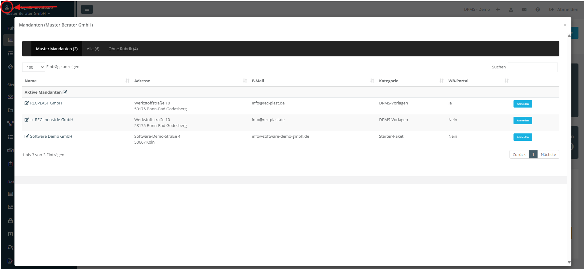 - Kunden des DPMS-Servers steht auf Anfrage eine neue Mandanten-Übersicht im Beraterkonto zur Verfügung. Über diese können sich Berater schneller bei einem Mandanten anmelden.