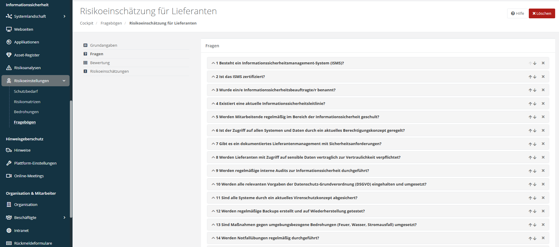 - Um Sie beim Thema Lieferantenmanagement weiter zu unterstützen, haben wir außerdem ein neues Vorlagenpaket erstellt. Es enthält eine Muster-Lieferantenrichtlinie, einen Fragebogen für den Versand an Ihre Dienstleister sowie mehrere Checklisten, die Sie bei der Aufnahme und Bewertung begleiten.
