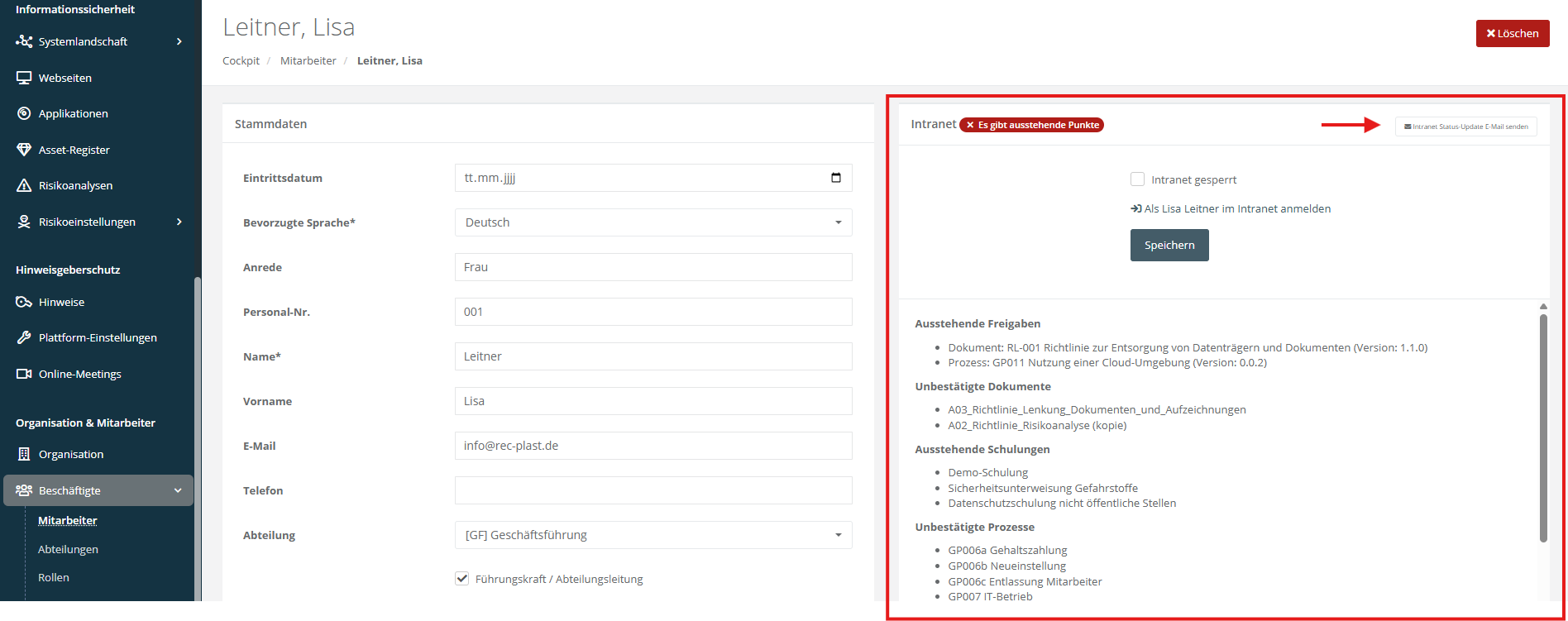 - In der Einzelansicht der Beschäftigten wird nun darüber informiert, ob es noch ausstehende Punkte gibt (Intranet-Status). Benutzer mit Admin-Berechtigungen sehen Details zu den offenen Aufgaben – zum Beispiel zu unterzeichnende Dokumente oder durchzuführende Schulungen.